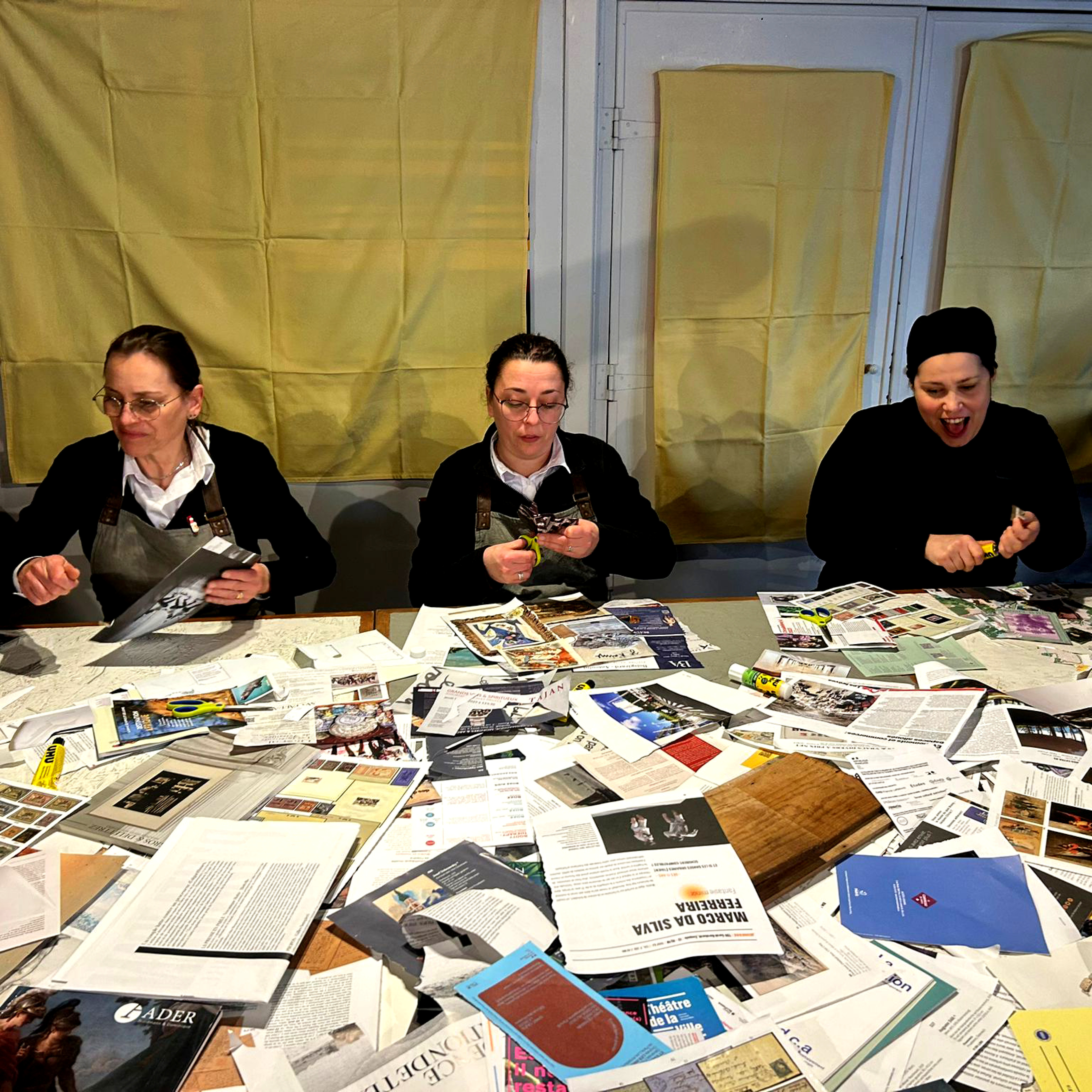 The art studio she shared between 2023 and 2024 was in Bagnolet, at La Noue neighbourhood (shared with the artists Carolina E. Santo, Djamel Tatem and Jean François H.) La Noue is a social district on the outskirts of Paris known for its social diversity and people in social situation of care. Rita collects these free paper materials everywhere she visits: social centres, art institutions (Palais de Tokyo, Centre 104, Centre Pompidou) theatres, restaurants, etc.